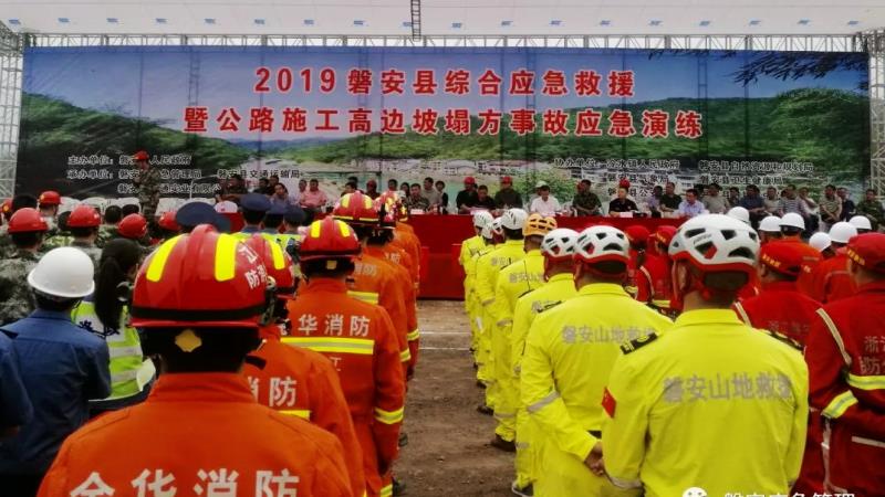 本次活動是由磐安縣人民政府主辦,42省道(二期)改建項目部與磐安縣應急管理局、交通運輸局、交投公司等單位共同承辦,路橋工程公司書記朱華生、副總經理曹剛也參加了這次觀摩演練。