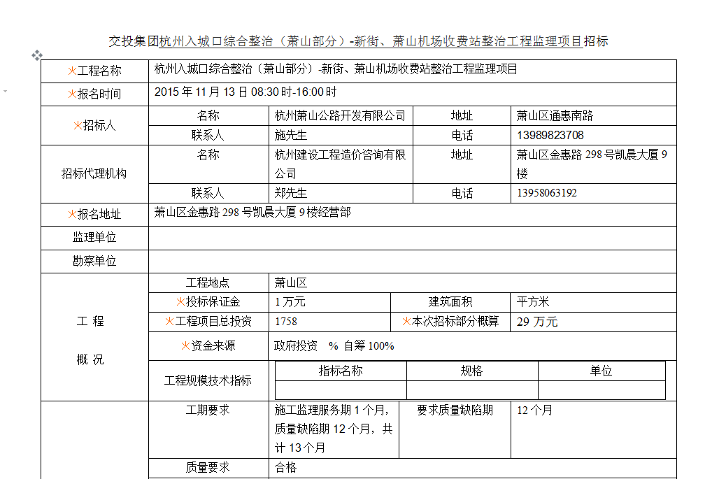 交投集團杭州入城口綜合整治(蕭山部分)-新街、蕭山機場收費站整治工程監理項目招標