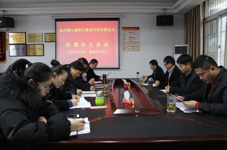 2018年1月2日,元旦假期結束的第一天,浦陽江開發公司召開經理辦公會議,專題總結2017年全年的工作成績和經驗,分析當前公司面臨的形勢,查找工作中存在的不足,明確公司在2018年的工作任務和發展目標,公司班子成員、部門負責人、工青婦負責人參加了本次會議。會上,公司部門和工青婦負責人分別匯報了2017年的成績及2018年的工作思路,反思了工作存在的問題,班子領導對工作方向進行布置和安排。最后,韓總對2018年公司各項目標任務進行明確,并提出了全局觀念、責任擔當、工作有計劃、團結協作、做最好的自己、廉潔自律六方面的要求。