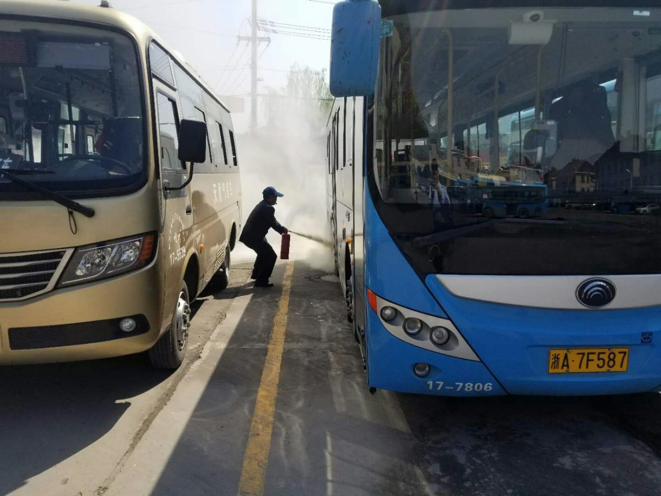 10時05分,場區啟動停車場消防應急預案。10時06分,場站人員發現義橋公交站東南區塊濃煙滾滾,迅速吹響口哨并打開大門,同時通知在場人員火警情況;10時07分,司機、站員、物業人員迅速趕至起火點開展滅火自救,并由傅隊進行指揮,10時08分,消防水帶出水,10時09分“火勢”撲滅,警報解除。